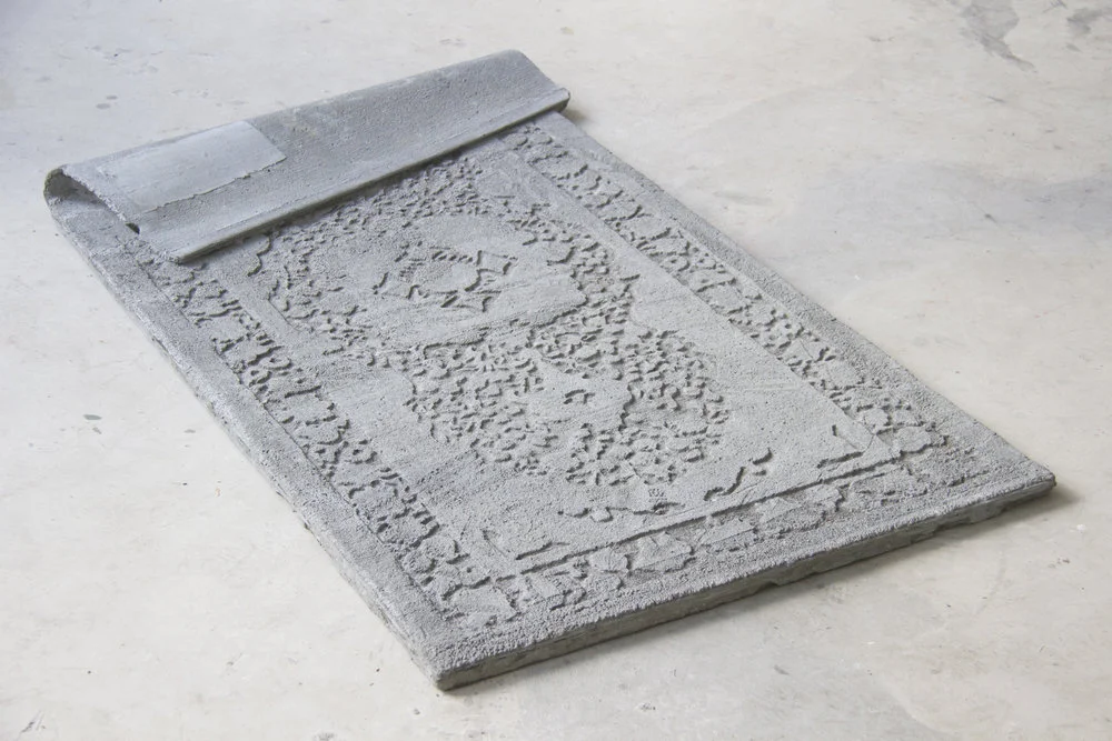 While You Were Sleeping is the first joint presentation of Fadi al-Hamwi and Hiba al-Ansari, a view into the conceptual and material dialogue between their practices. The artists studied together at the Damascus Academy of Fine Arts and have maintained a close relationship since then. Al-Ansari and al-Hamwi concern themselves with lending physical shape to the human experience of war, but the human figure remains obscured in their multi-media practices. Instead, domestic furnishings, a cow carcass or toy soldiers offer traces of the lack of humanity in the everyday experience of conflict. A dialogue emerges between the artists’ common motif and material, revealing a parallel and deeply personal process of reckoning. Re-imagined domestic furnishings – a cement carpet, a map etched into a duvet – occupy the space, conjuring mirages of rooms left behind.